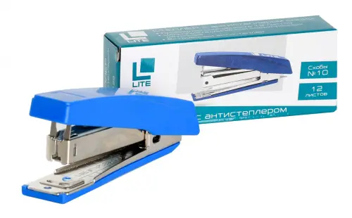 Классический степлер LITE №10 одновременно сшивает до 12 листов и обеспечивает качественное скрепление документов. Позволяет производить сшивание закрытым способом. Облегчённый пластиковый корпус синего цвета и цельнометаллический сверхпрочный механизм. Имеется встроенный антистеплер. Используются стандартные скобы № 10. Глубина закладки бумаги — 53 мм, без возможности регулирования глубины закладки бумаги. Габариты: высота — 38 мм, ширина — 18 мм, длина — 93 мм.