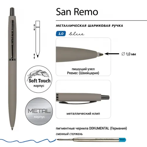 Металлическая шариковая ручка «San Remo» - аксессуар, призванный стать настоящим элементом стиля, подчеркнуть индивидуальность его владельца.