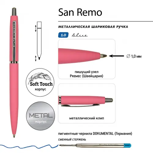 Металлическая шариковая ручка «San Remo» - аксессуар, призванный стать настоящим элементом стиля, подчеркнуть индивидуальность его владельца.