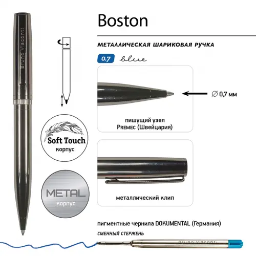 Ручка автоматическая, с легким поворотным механизмом подачи стержня. Надежный пишущий узел d 0,7 мм (от швейцарского производителя Premec) гарантирует высокое качество так же, как и пигментные чернила Dokumental (Германия). Благодаря им писать ручкой "Boston" одно удовольствие - она мягко скользит по поверхности бумаги, оставляя ровную, четкую линию.