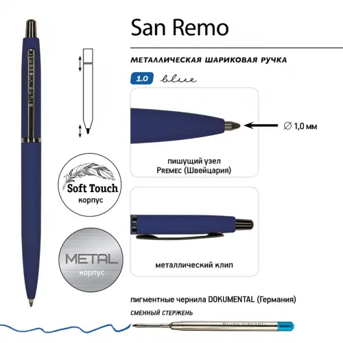 Металлическая шариковая ручка "San Remo" - аксессуар, призванный стать настоящим элементом стиля, подчеркнуть индивидуальность его владельца.