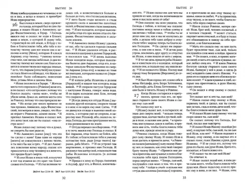 Священное Писание в Синодальном переводе. Неканонические книги Ветхого Завета помещены отдельно перед книгами Нового Завета. Деление текста на главы дополнено делением на смысловые отрывки без подзаголовков.