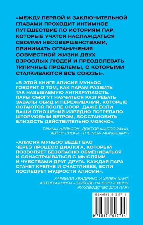Отзыв от Харвилл Хендрикс и Хелен Хант, авторов книги "Любовь на всю жизнь. Руководство для пар": "Алисия Муньос ведет вас через процесс диалога, который позволяет безопасно обмениваться и сонастраиваться с мыслями и чувствами друг друга. Каждая пара станет крепче и счастливее, если последует мудрости Алисии".