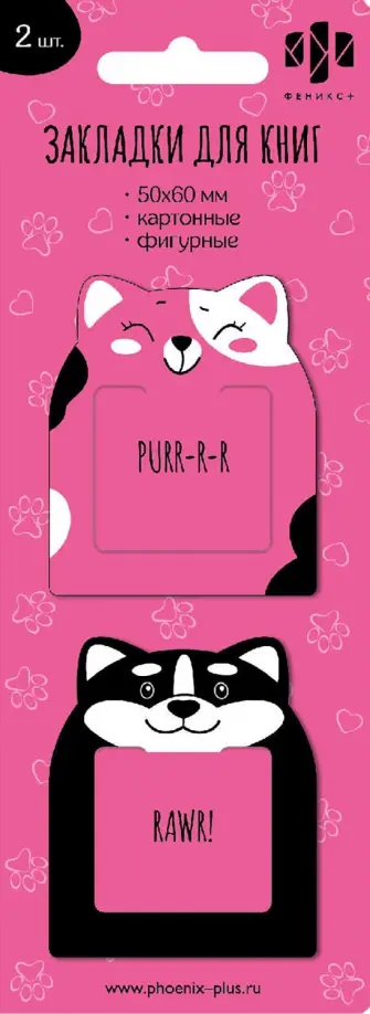 Закладка для книг фигурная арт. 65137 / 48 КОТ И ПЁС (2 шт. в наборе, размер 50х60 мм, материал: дизайнерский картон; цвет: чёрный, розовый, декор: фигурная вырубка, шелкография в две краски, индивидуальная упаковка: подложка из мелованного картона + ПЭТ-пакет с европодвесом)