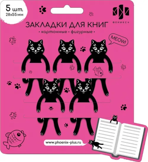 Закладка для книг фигурная арт. 65149 / 160 КОТЫ (5 шт. в наборе, размер 28х55 мм, материал: дизайнерский картон; цвет: чёрный, декор: фигурная вырубка, шелкография в одну краску, индивидуальная упаковка: подложка с европодвесом из мелованного картона + ПЭТ-пакет)