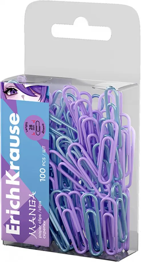 Скрепки металлические с виниловым покрытием ErichKrause Manga, 28мм, ассорти (в пэт-боксе по 100 шт.)