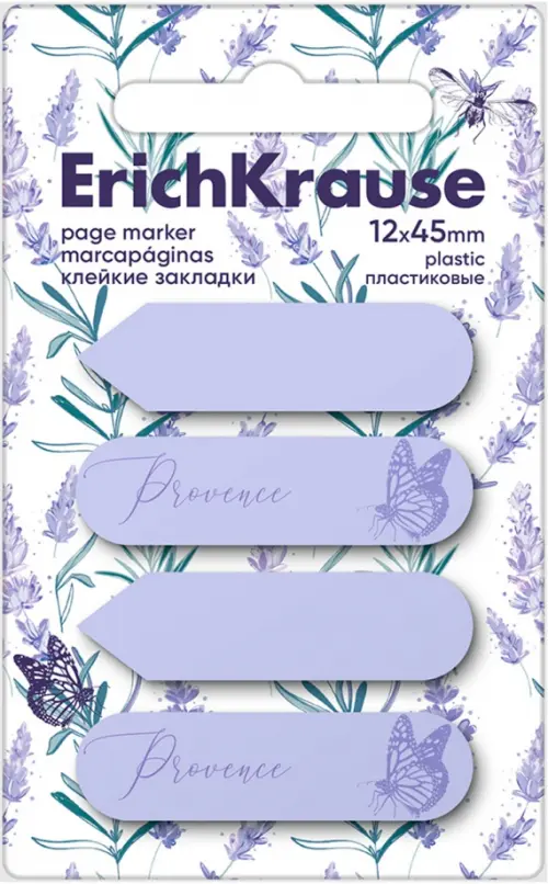 Клейкие закладки пластиковые ErichKrause предназначены для временных пометок страниц. На закладках можно делать надписи. Изготовлены из цветной полупрозрачной полимерной пленки, которая не закрывает текст страницы. Специальный клеевой состав позволяет надежно крепить и многократно переклеивать закладки, не оставляя следов и не повреждая поверхность. Размер закладки - 45X12 мм. В упаковке 80 листов коллекции Lavender.