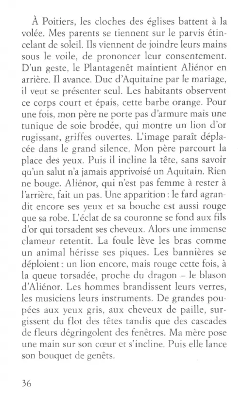 « Sa robe caresse le sol. À cet instant, nous sommes comme les pierres des voûtes, immobiles et sans souffle. Mais ce qui raidit mes frères, ce n’est pas l’indifférence, car ils sont habitués à ne pas être regardés ; ni non plus la solennité de l’entretien – tout ce qui touche à Aliénor est solennel. Non, ce qui nous fige, à cet instant-là, c’est sa voix. Car c’est d’une voix douce, pleine de menaces, que ma mère ordonne d’aller renverser notre père. »