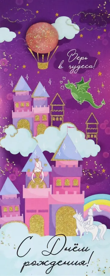 Очаровательный конверт для денег со сказочными иллюстрациями и надписью "С днем рождения!". Воздушные замки, сияющие звезды, облака, дракон, прекрасная принцесса и бесстрашный рыцарь - такое оформление очаровывает с первого взгляда! Конверт отлично подойдет для подарка девочке или юной девушке. Материал - плотный картон. Сверху на картонную основу нанесено яркое красочное изображение, декорированное светящимися блестками. На обратной стороне есть теплые пожелания. Размеры конверта - 168 х 84 мм. Формат - евро. Конверт подходит для купюр разного номинала. Внутри можно написать несколько приятных слов, а также имя адресата. В подарок приложен небольшой мячик-попрыгун. Заказать конверты для денег оптом можно на нашем сайте. Количество конвертов в одной упаковке - 1 штука.