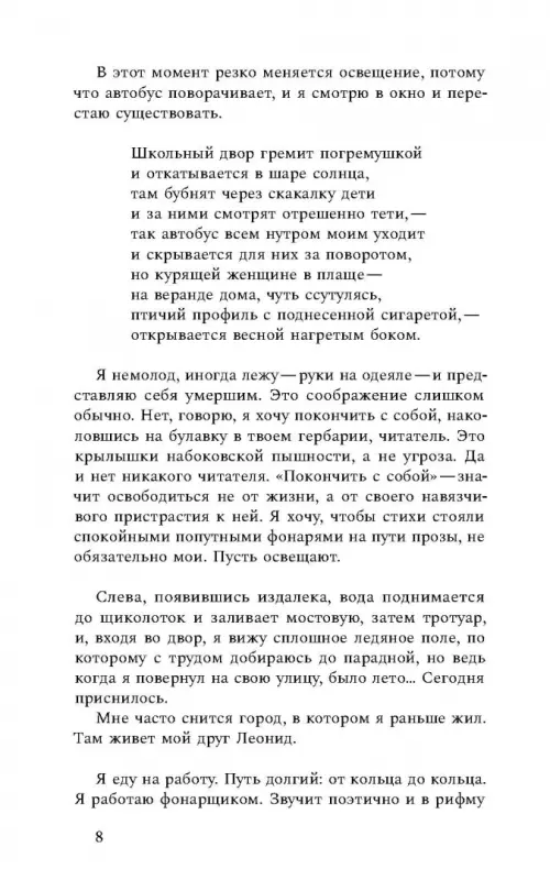 "Все творчества - кульминация головокружительного ужаса смерти. Но они же, по третьему закону Ньютона, - отчаянная жажда самоутверждения и жизни". "Я знаю свои фонари наизусть. Пожалуй, прошел бы их вслепую. И не только. Я знаю почти наверняка, какой сегодня не горит, а какой начинает предупреждающе помигивать". Эпизоды биографии и фрагменты окружающего мира, увиденные сквозь тонкую поэтическую линзу, скреплены в романе Владимира Гандельсмана центральным образом фонарей, за которыми должен следить герой, похожий на обязательного фонарщика из "Маленького принца". Сберегая буквальный, физический свет, он так же заботливо хранит вспышки воспоминаний о близких и всполохи собственной творческой жизни. Во вторую часть книги вошел комментарий к стихотворениям Владимира Гандельсмана, написанный его двоюродным братом Александром. В этих заметках разворачивается история лирического героя поэзии Владимира, рассказанная с позиции, крайне близкой автору биографически и метафизически. Владимир Гандельсман - поэт и переводчик, лауреат премии "Московский счет" (2011).
