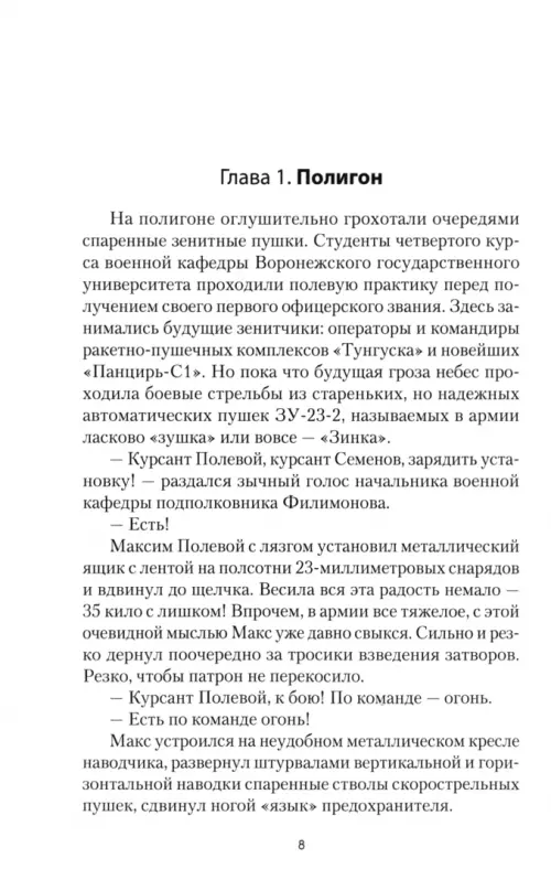 Роман о судьбах простых русских людей, которые по зову сердца встали на защиту Донбасса еще в 2014 году, о непростом выборе между спокойной жизнью и долгом, а также (впервые в отечественной художественной литературе) о боевом применении новейших зенитных ракетно-пушечных комплексов «Панцирь-С1». Автор — уроженец Донбасса, военный медик, служил в одном из танковых подразделений ДНР, с началом Специальной военной операции в качестве военного корреспондента освещал освобождение Волновахи и Мариуполя. В книгу вошли как примеры общения с гражданским населением, с военнослужащими ДНР и РФ, так и личный опыт выживания в течение восьми лет необъявленной войны против Русского Донбасса, реалистично показана тревожная жизнь шахтерских городов, армейский быт, глубоко, насколько позволяют открытые источники информации, освещены технические особенности и боевая работа Войск противовоздушной и противоракетной обороны.