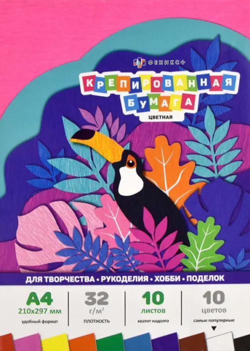 Бумага крепированная А4, арт. 65999 / 20 ЦВЕТНАЯ (10 ЦВЕТОВ) (размер 210х297 мм, 10 листов, 10 цветов, флат-листы плотностью 32 г/м2, обложка: обложка-вкладыш, мелованная бумага 115 г/м2, полноцветная печать; индивидуальная упаковка: ПЭТ-пакет с европодвесом)