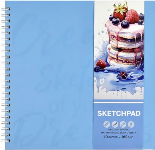Альбом для рисования (Скетчпад), ДЕСЕРТ. Размер 210х210 мм, Количество листов: 40 листов. Внутренний блок - белый офсет 160 г/м?. Обложка - мелованная бумага 115 г/м?, матовая ламинация. УФ-лак выборочный . Вид крепления - твёрдый переплёт на гребне.
