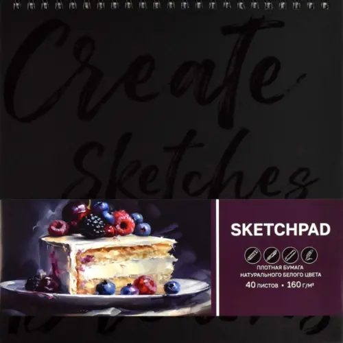 Альбом для рисования (Скетчпад), СЛАДОСТЬ. Размер 210х210 мм, Количество листов: 40 листов. Внутренний блок - белый офсет 160 г/м?. Обложка - мелованная бумага 115 г/м?, матовая ламинация. УФ-лак выборочный . Вид крепления - твёрдый переплёт на гребне.