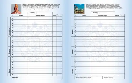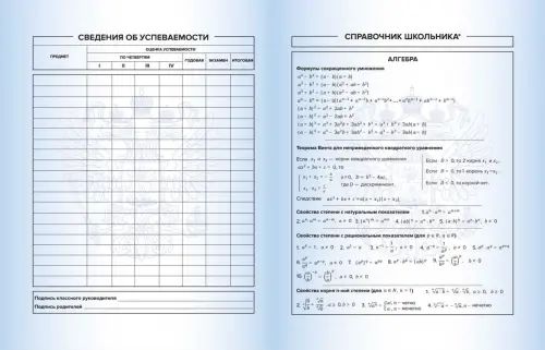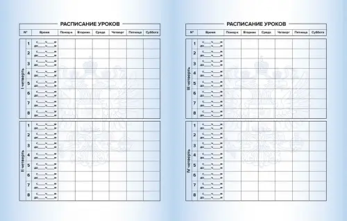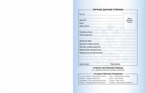 Дневник российского школьника, ТРИАДА формат А5+, 48 л., твёрдый переплёт, отделка обложки: полноцветная печать, глянцевая ламинация, красочность блока: полноцветная печать, красочность форзаца: печать в одну краску. Блок: бумага - белый офсет, 65 г/м?, универсальная шпаргалка.