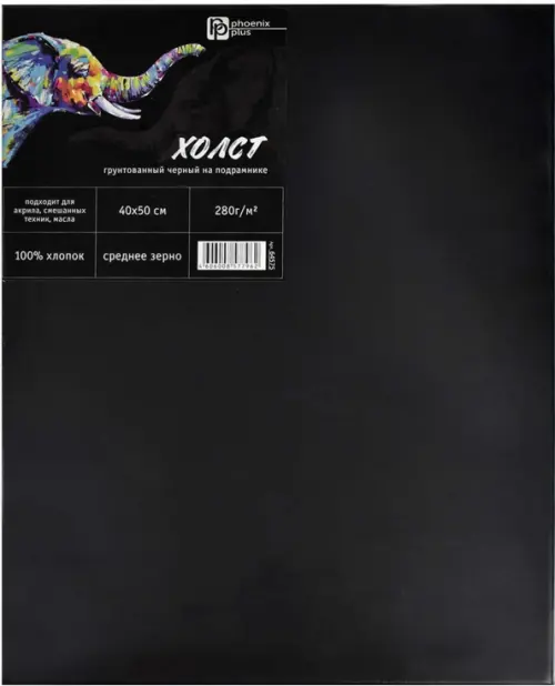Холст художественный. СЛОН. Цвет: чёрный. Размер: 40х50 см. Материал: хлопок 100%. Индивидуальная упаковка: ПЭТ-плёнка. Особенности: грунтованный, для акрила, масла, смешанных техник.