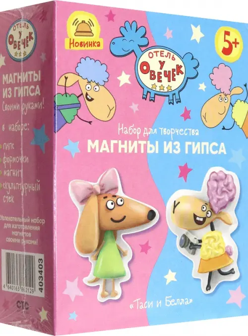 "Отель у Овечек" Является любимым мульсериалом и пройти мимо этого работа мы просто не могли! Коробочка выглядит презентабельно, на ней изображены главные героини - овечки Таси и Белла. Набор в заявленной комплектации. Поделка легка в исполнении. Разводишь водой гипс, заливаешь в формочку, магнит мы прикрепили сразу, слегка вдавив в массу...