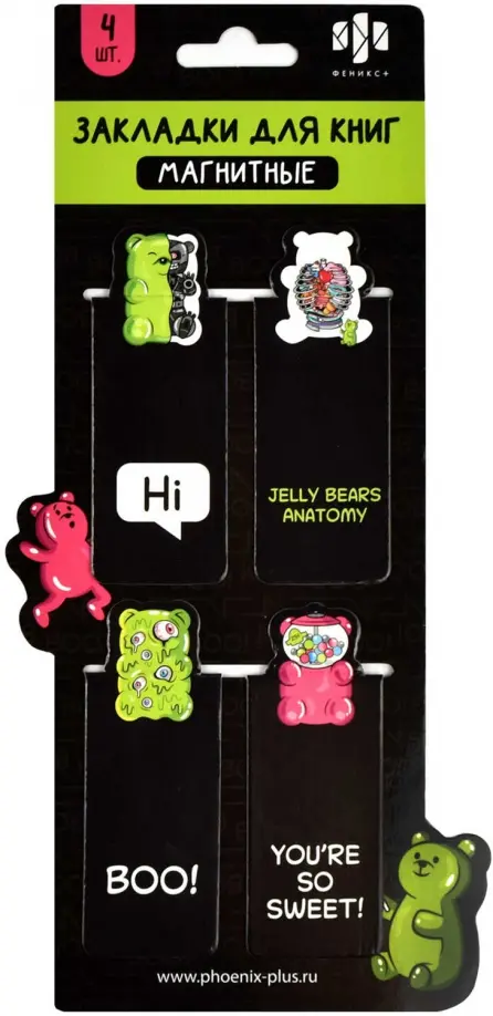 Набор закладок магнитных для книг арт. 65048/К / 100 ЖЕЛЕЙНЫЕ МИШКИ (4 шт. в наборе, размер 30x60 мм, материал: ПВХ, ферроагломерированный полимер; цвет: зелёный, розовый, чёрный, декор: полноцветный дизайн, фигурная вырубка, особенности: глянцевая ламинация, индивидуальная упаковка: подложка с европодвесом из мелованного картона + ПЭТ-пакет)
