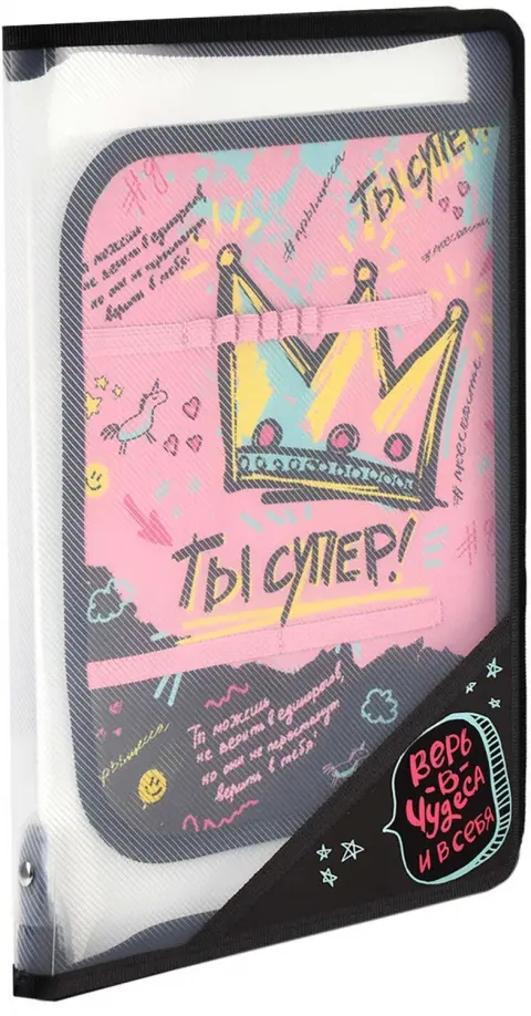 Папка для уроков труда пластиковая Феникс+, арт. 66310/ 12 ТЫ СУПЕР! (полипропилен, формат А4, 22.8x32.8 см, 1 отделение (-я), молния, внутренний разделитель с эластичными держателями для канцелярских принадлежностей, УФ-печать)