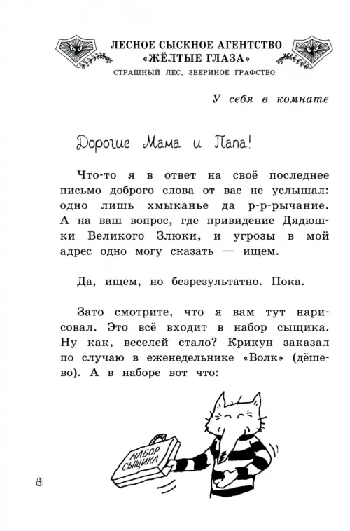 Вместе с друзьями Вонючкой, Косолапусом и Пострелом он расследует ужасные преступления, таинственные исчезновения и коварные похищения и, конечно, пишет обо всём подробные отчеты папе и маме. Четвёртая книга, как и предыдущие, состоит из смешных писем, то счастливых, то жалобных, то возмущённых, а ещё рисунков, листов, вырванных из сыщицкого блокнота, объявлений, афиш и чернильных клякс.