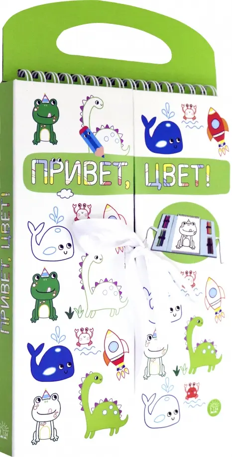 Под твёрдой обложкой с удобной ручкой и ленточками-завязками прячется раскраска-блокнот. На отрывных страничках простые и забавные рисунки с толстыми контурами: звери, клоуны, цветы, фрукты и машинки. В наборе 12 цветных карандашей.