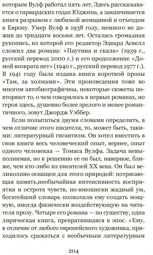 "Если попытаться двумя словами определить, в чем отличие этого писателя, то, может быть, такими: литературный гигантизм. Он хотел вместить в свои книги весь человеческий опыт, вернее, опыт одного человека - Томаса Вулфа. Задача невыполнимая, но к решению ее он был, наверное, ближе, чем кто-либо из писателей XX века… Все, что дала в литературе вторая половина XX века, рядом с Вулфом кажется малокровным…" (В. Голышев)
