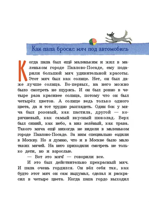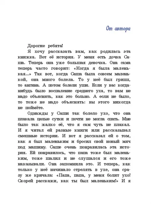 В книгу Александра Раскина вошли короткие и забавные, поучительные и весёлые истории о детстве, которые рассказывает папа своей маленькой дочке Саше. В каждой такой истории маленький папа ведёт себя как самый обычный мальчишка: бывает, что он капризничает и жадничает, хвастается или трусит, а ещё он сочиняет стихи, дрессирует собак, играет в пинг-понг, очень любит читать и рисовать. И хотя маленький папа живёт в другом, давнишнем мире, сам он - настоящий и понятный, нисколько не идеальный, и поэтому сразу внушает доверие и симпатию.