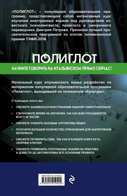 Начальный курс итальянского языка разработан по материалам популярной образовательной программы "Полиглот", выходившей на телеканале "Культура". В печатной версии курса даны упражнения, основные правила произношения и сведения о глаголах. С помощью шестнадцати уроков по методике Дмитрия Петрова вы сможете освоить базовые алгоритмы языка, применить их на практике и довести до автоматизма. В помощь тем, кто занимается самостоятельно, предлагается полный сборник ключей, т.е. выполненных упражнений. Теперь читатели смогут проверить, правильно ли они усвоили грамматические правила, и внести необходимые коррективы в процесс изучения языка.