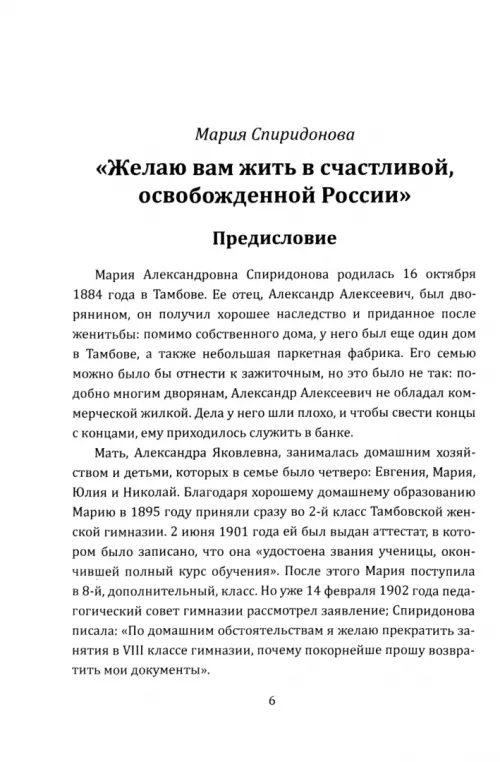 "Чувствую себя счастливой умереть за святое дело народного освобождения. Прощайте, дорогие друзья, желаю вам жить в счастливой, освобожденной вами России", - так писала из тюрьмы накануне казни Мария Спиридонова. Она совершила ставшее известным всей России покушение на царского чиновника Луженовского, жестоко подавлявшего крестьянские волнения. Ее подруга Ирина Каховская позже организовала убийство командующего оккупационными войсками на Украине генерала Эйхгорна. Смертная казнь была заменена для Марии Спиридоновой каторжными работами, а после 1917 года ее называли "самой влиятельной женщиной России"; она входила в высшие органы советской власти, однако из-за несогласия с политикой большевиков перешла в оппозицию и стала главным организатором восстания левых эсеров в июле 1918 года. В книге приводятся воспоминания М.А. Спиридоновой и И.К. Каховской, а также документы, связанные с их деятельностью. Всё это позволяет понять, почему женщины шли в революцию и готовы были отдать жизнь за её идеалы.