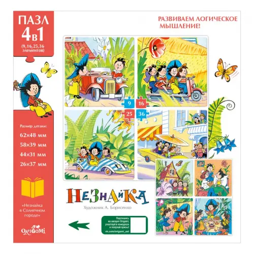 Набор пазлов 4в1 - это комплект пазлов с разной элементностью, включающий в себя головоломки из 9, 16, 25 и 36 элементов, объединенных иллюстрациями Борисенко из всеми любимой сказки о приключениях Незнайки. Такой набор пазлов понравится любому ребенку. Постепенно усложняя сборку пазла от 9 элементов до 36 элементов, ребенок научится внимательности, концентрации, а также сможет развить мелкую моторику.