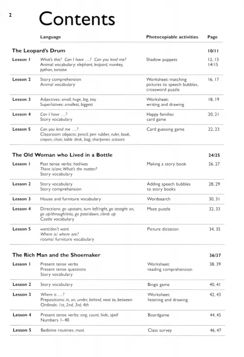 Each story covers a number of lessons, with a wide variety of activities, practising specific language and vocabulary. These activities are also designed to help teachers exploit other similar stories with their pupils.