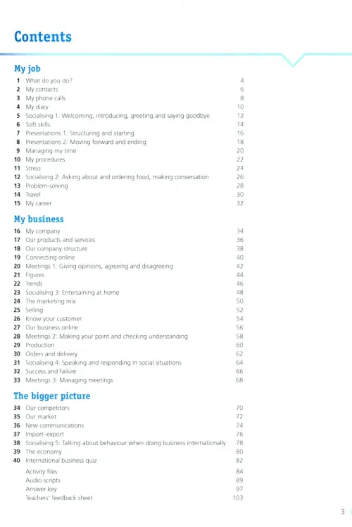 Each level of Heads up is divided into 40 two-page units which get right to the heart of students' needs. The units are divided into three sections growing from My job through to My business and finally to The bigger picture.
