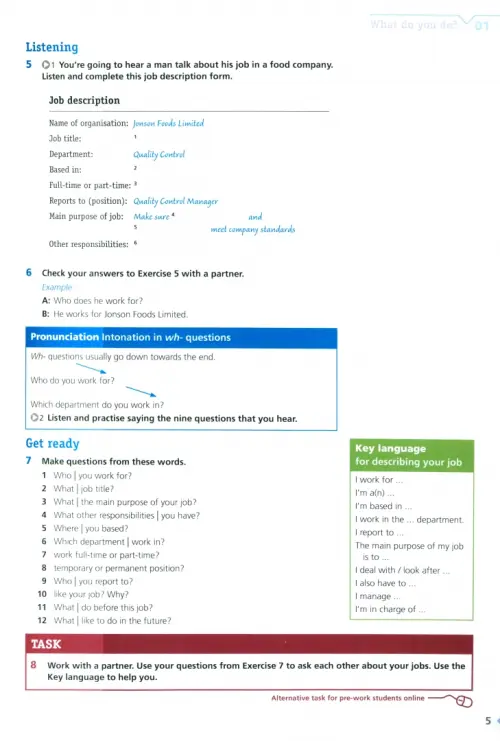 is followed by a preparatory section - Get ready - which prepares users for the personalised Task at the end of the unit. This enables students to apply vocabulary from the Key language section to their own situation. There is also a focus on pronunciation work, with attention paid to elision, stress and intonation.
