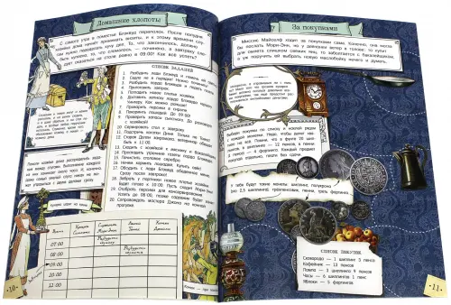 Что внутри? Путешествие по британским колониям, первая в мире почтовая марка, шиллинги и пенсы, игры и лабиринты, пудинг миссис Симмонс, задания на смекалку и наблюдательность, пособие по сочинению лимериков, изящные наряды, логические задачки, званый обед, прогулка по Лондону - в общем, настоящая викторианская жизнь.
