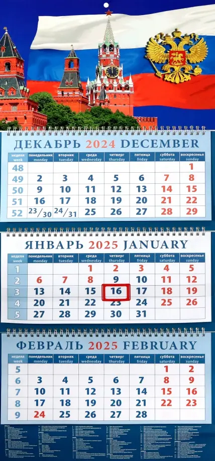 Календарь квартальный на 2025 год Кремль на фоне Государственного флага