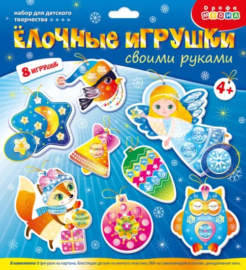 В комплекте: 8 фигурок из картона, блестящие детали из мягкого пластика ЭВА на самоклеящейся основе, декоративная нить, инструкция.