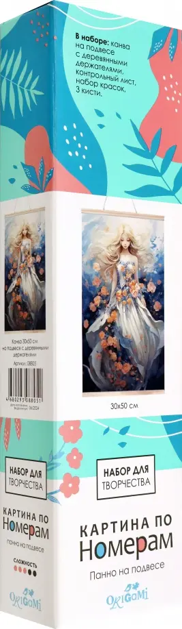 В наборе: холст с нанесенным контурным рисунком, 3 кисточки, акриловые краски, контрольный лист