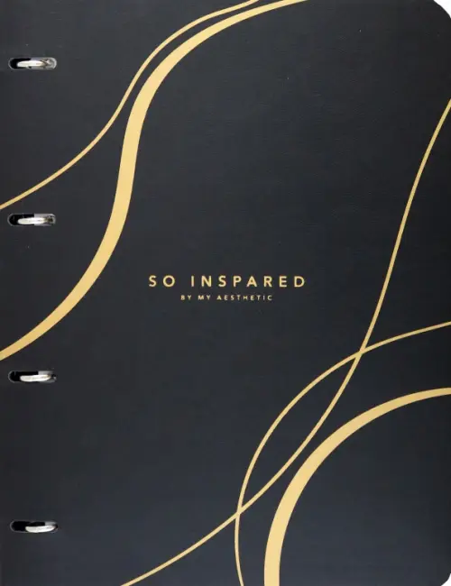 Обложка: снаружи - искусственная кожа; внутри - черный картон 700 г/м2. Кольцевой механизм. Внутренний блок: офсетная печать, бумага 100% белизны, 65г/м2. Дизайн внутреннего блока "в клетку". Особенности: печать золотой шелкографией, черная резинка.
