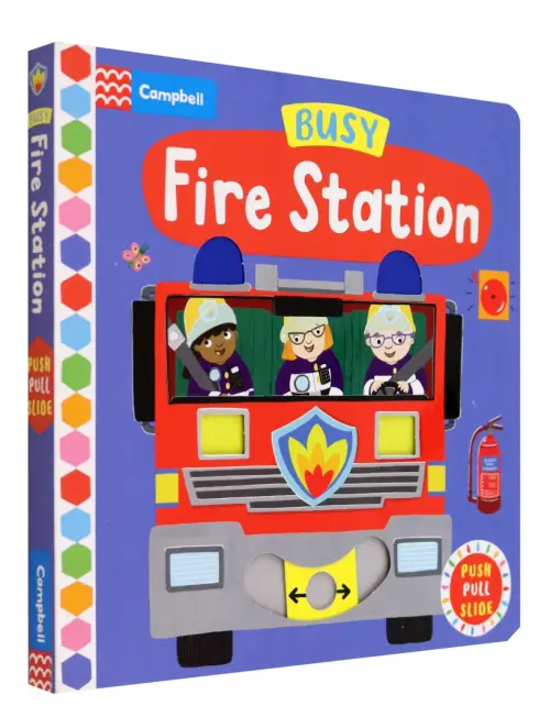 Push, pull and slide the tabs to be a part of the Busy Fire Station! Join in with the firefighters as they slide down the pole, drive the fire engine and put out a fire while everyone cheers.