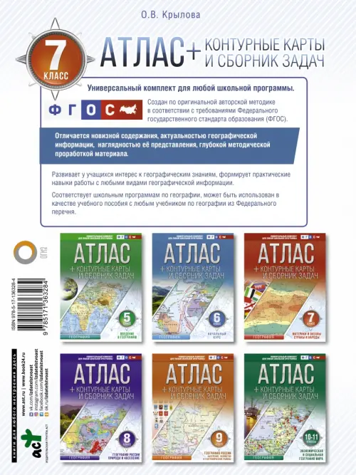 Универсальный учебно-методический комплект по географии для 7-го класса (автор - О.В. Крылова) включает в себя атлас "Материки и океаны. Страны и народы", сборник задач по работе с атласом и контурные карты с учебными заданиями. Комплект разработан в соответствии с "Концепцией развития географического образования в Российской Федерации" и направлен на овладение учащимися универсальными учебными действиями, в том числе познавательными. Изучение материалов атласа, выполнение заданий для самостоятельной работы существенно расширит объём познаний учащихся о природе и населении Земли, о географических особенностях материков и океанов. В данном пособии значительно увеличена вариативность заданий по картам атласа и контурным картам. Наряду с проверочными работами в форме традиционных вопросов учащимся предлагаются задания по составлению собственных карт, в том числе в составе коллектива. Большое внимание уделяется проверке навыков работы с различными видами и источниками географической информации. Предлагаемый комплект подходит ко всем школьным программам и учебникам по географии, соответствует требованиям ФГОС и одобрен методистами.