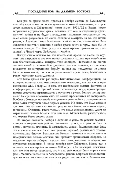Книга представляет собой 24-й том из серии, посвященной Белому движению в России, и знакомит с заключительным этапом Гражданской войны на территории исторической России - боям и политической обстановке в 1921-1922 гг. в Приморье. Подробно описан так называемый Хабаровский поход, взятие Хабаровска и отступление. Несомненный интерес представляют воспоминания участников тех событий, связанных с созывом Приамурского Земского собора, деятельностью генерала М.К. Дитерихса, эвакуацией армии в Китай.