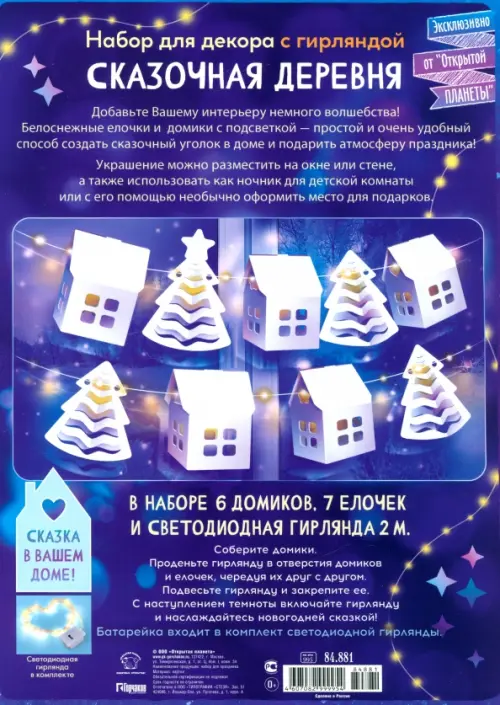 В наборе 6 домиков и 7 елочек из плотного картона, а также светодиодная гирлянда длиной 2 м. Обратите внимание: батарейка в комплект не входит! Собрать украшение очень легко: необходимо продеть гирлянду сквозь домики и ёлочки, чередуя их между собой. Закрепить декор на поверхности можно с помощью иголок или скотча. Сказочная деревня готова!