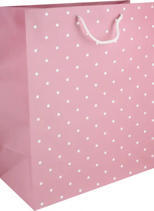 Большой и вместительный нежно-розовый пакет в классический белый горох, размер L. Позволит упаковать объемный подарок, сувенирный набор.