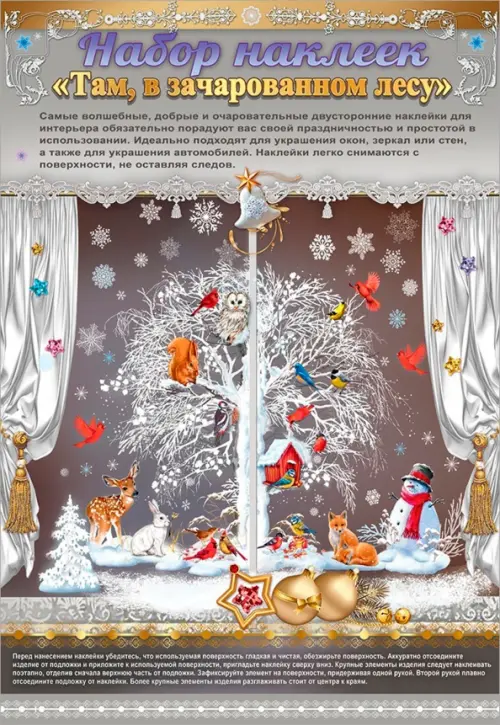 Набор оформительских наклеек "Там, в зачарованном лесу" украсит дом к зимнему сезону. Это отличный способ преобразить интерьер к светлым и волшебным праздникам - Новому году и Рождеству. В наборах вы найдете очаровательные двусторонние наклейки, которые порадуют своей праздничностью и простой в использовании. Наклейки изготовлены из ПВХ. Изображение нанесено с двух сторон. Декоративные виниловые наклейки не оставляют следов, выдерживают высокие температуры, не боятся влаги. Их можно приклеить на любую поверхность: стекло, дерево, метал, пластик, кафель, обои. Наклейки можно приклеить на окна, двери, а также на стены в комнате. Благодаря двустороннему изображению, наклейки эффектно будут смотреться на стеклянных прозрачных поверхностях. Наклейки можно использовать многократно! Когда зимние праздники закончатся, просто аккуратно снимите наклейки и приклейте обратно на пленку. На следующий год они снова будут радовать вас! Украшение отлично подойдет для дома, детского сада или школы. Такой рождественский сувенир понравится и детям, и взрослым.