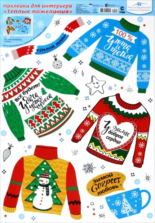 Оригинальные пожелания на весёлых вязаных свитерах, чашке и шарфике согреют добрыми словами и дополнят приятную атмосферу зимнего праздника милым теплом и уютом! Разные наклейки этой серии прекрасно сочетаются друг с другом и легко объединяются для создания больших композиций.