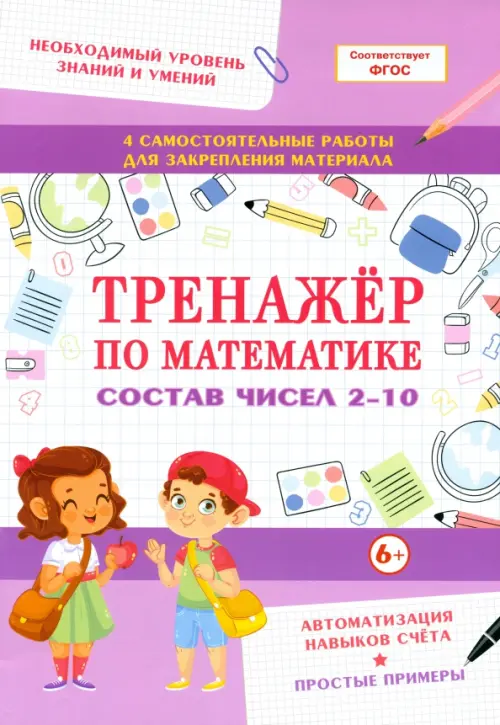 Материал в этом тренажере подобран по темам в соответствии с программой обучения начальной школы и комплексно развивает необходимые навыки для успеха в учебе. С помощью простых заданий ребенок научится раскладывать числа от 2 до 10 по составу и автоматизирует это умение. Благодаря самостоятельным работам со шкалой оценивания обучающийся повторит и закрепит изученный материал, а родитель сможет обратить внимание на пробелы в знаниях.