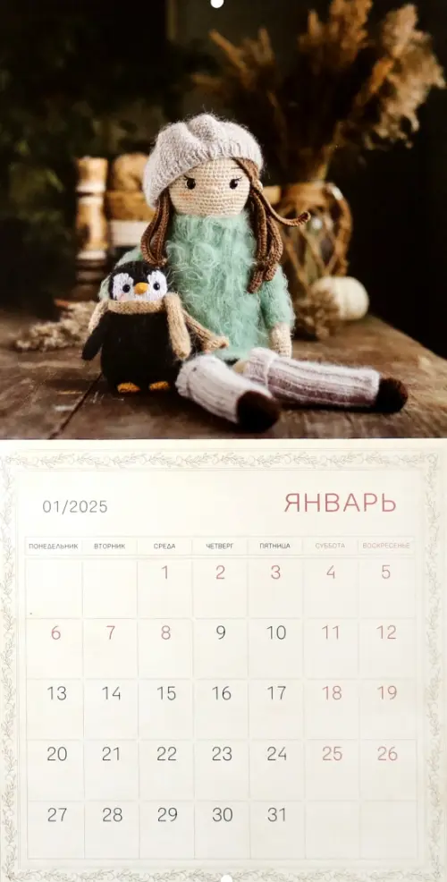 Этот уютный календарь - по-настоящему "ручной" работы. Кристина Цвикевич много лет создает красоту с пряжей, спицами и крючками. На свет появляются душевные и атмосферные игрушки, теплые и вызывающие приятные ассоциации с уютом и добром. Пусть в 2025 году очаровательные вязаные существа окунут вас в мир сказочного детства и подарят вдохновение.