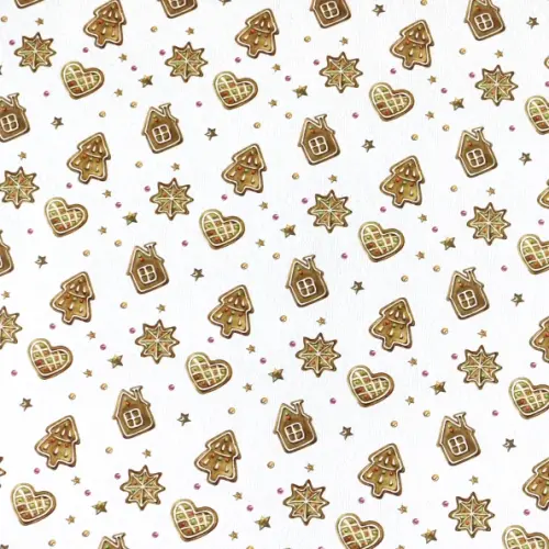 Упаковочная бумага с имбирными пряниками в виде елочки, снежинки, домика и сердечка сделает ваш новогодний подарок оригинальным и неповторимым. Красочное оформление порадует мужчину и женщину, мужа и жену, коллегу и друга на Новый год, Рождество или другой зимний праздник. Упаковочную бумагу можно использовать для оформления конфет, подарочных наборов и композиций.