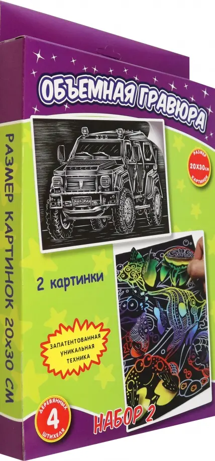 Творческий набор серии Объемная гравюра специально создан для самых маленьких деток, которые только начинают знакомиться с увлекательным миром творчества. Работая с гравюрой, малыш превратится в настоящего волшебника, который штрих за штрихом создает веселую и разноцветную картину. Увлекательный процесс надолго займет внимание малыша и подарит массу положительных эмоций. В наборе 2 большие гравюры. Одна объемная, нужно процарапать ее и отогнуть элементы, картинка становится 3д объемной. Вторая обычная гравюра. Формат: А4. Размер картинки: 20х30 см Развивает: - мелкую моторику рук - творческие способности - усидчивость и аккуратность Не предназначено для детей до 3-х лет. Для детей от 3-х лет.