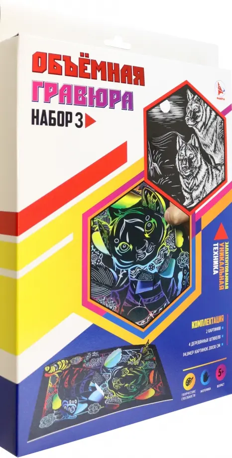 Творческий набор серии Объемная гравюра специально создан для самых маленьких деток, которые только начинают знакомиться с увлекательным миром творчества. Работая с гравюрой, малыш превратится в настоящего волшебника, который штрих за штрихом создает веселую и разноцветную картину. Увлекательный процесс надолго займет внимание малыша и подарит массу положительных эмоций. В наборе: 2 гравюры из плотного картона, 4 деревянных штихеля. Формат: А4. Размер картинок: 20х30 см. Не предназначено для детей младше 3-х лет. Наличие мелких деталей. Рекомендовано для детей старше 5 лет.